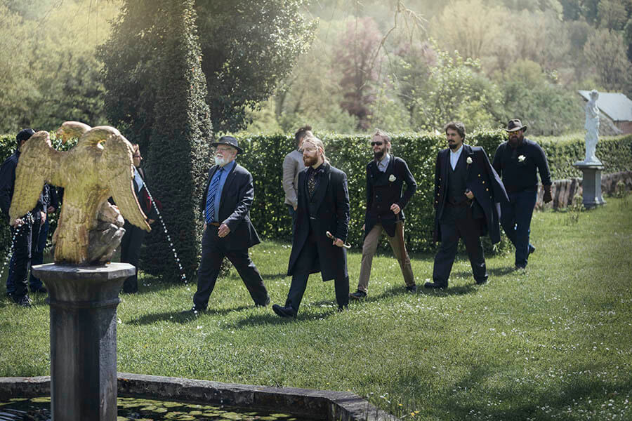 Les mariés sont arrivés chacun accompagné de sa suite, composée de proches et d'un témoin. Ensuite, un combat à l'épée a eu lieu ! Destinée à tromper les mauvais esprits, cette partie chorégraphiée permettrait de les chasser, en leur faisant croire qu'un malheur s'était déjà produit. Ainsi, la cérémonie s'est ensuite déroulée sans encombres - la météo a été clémente elle aussi !